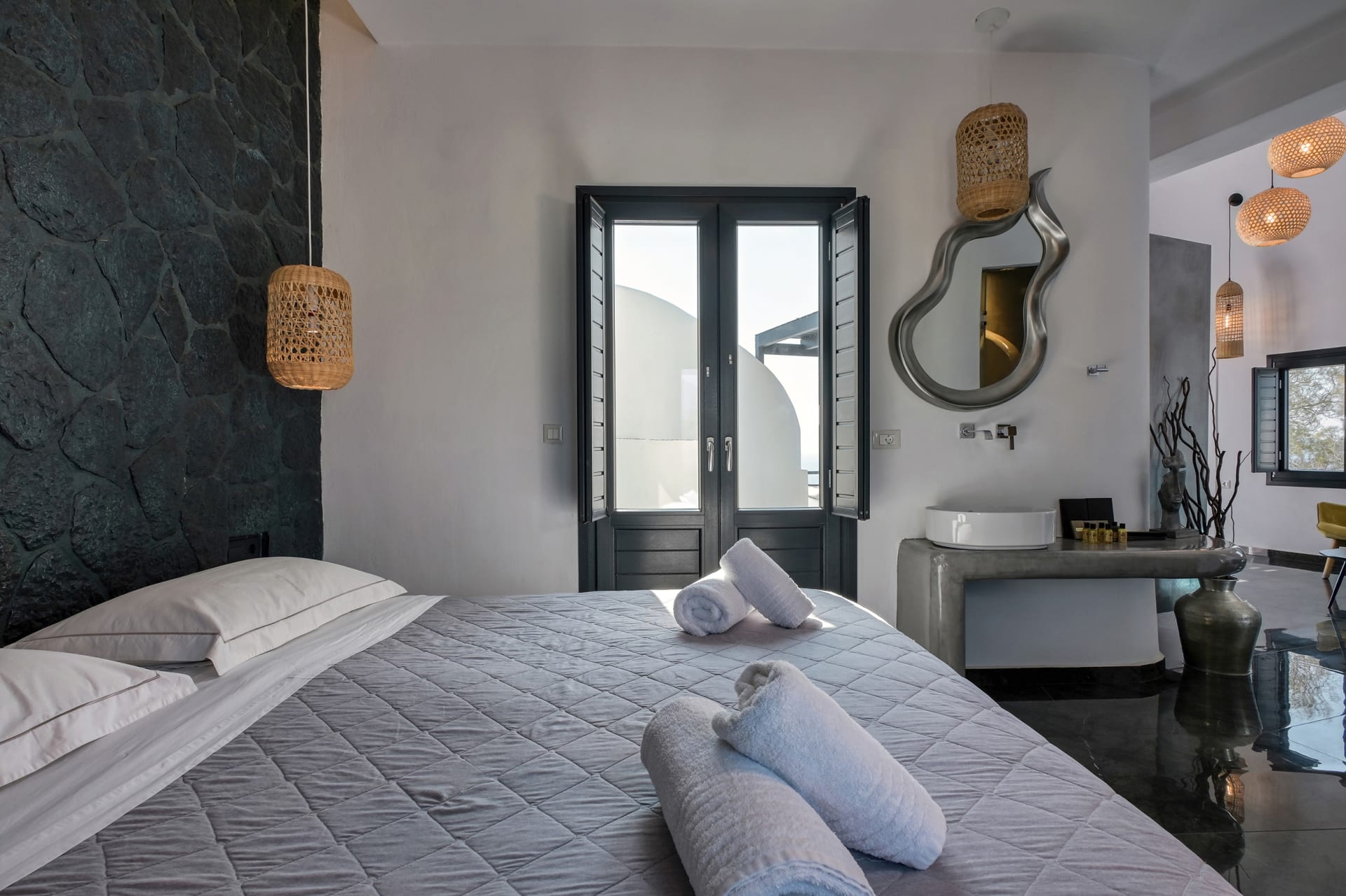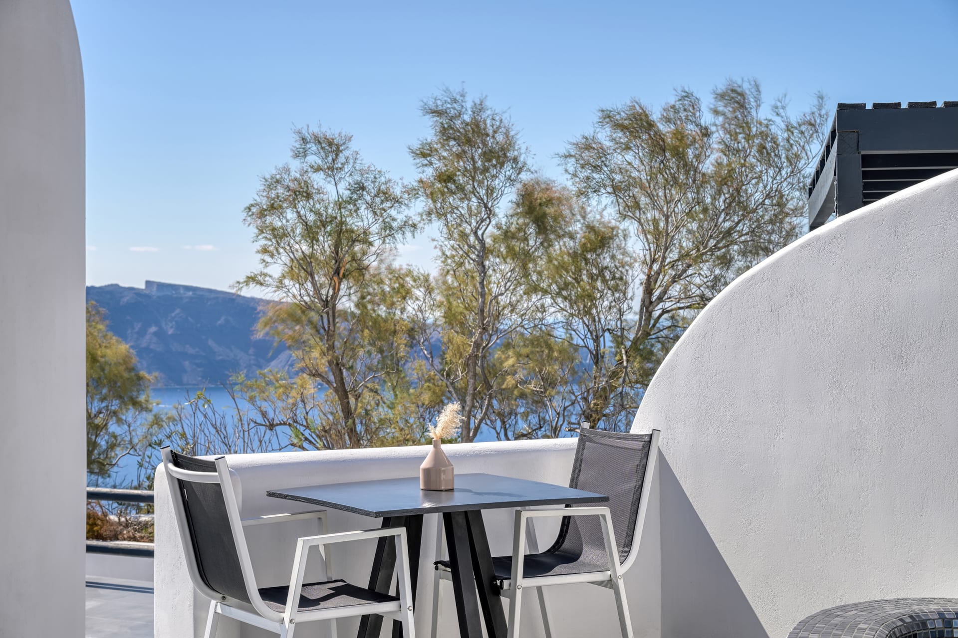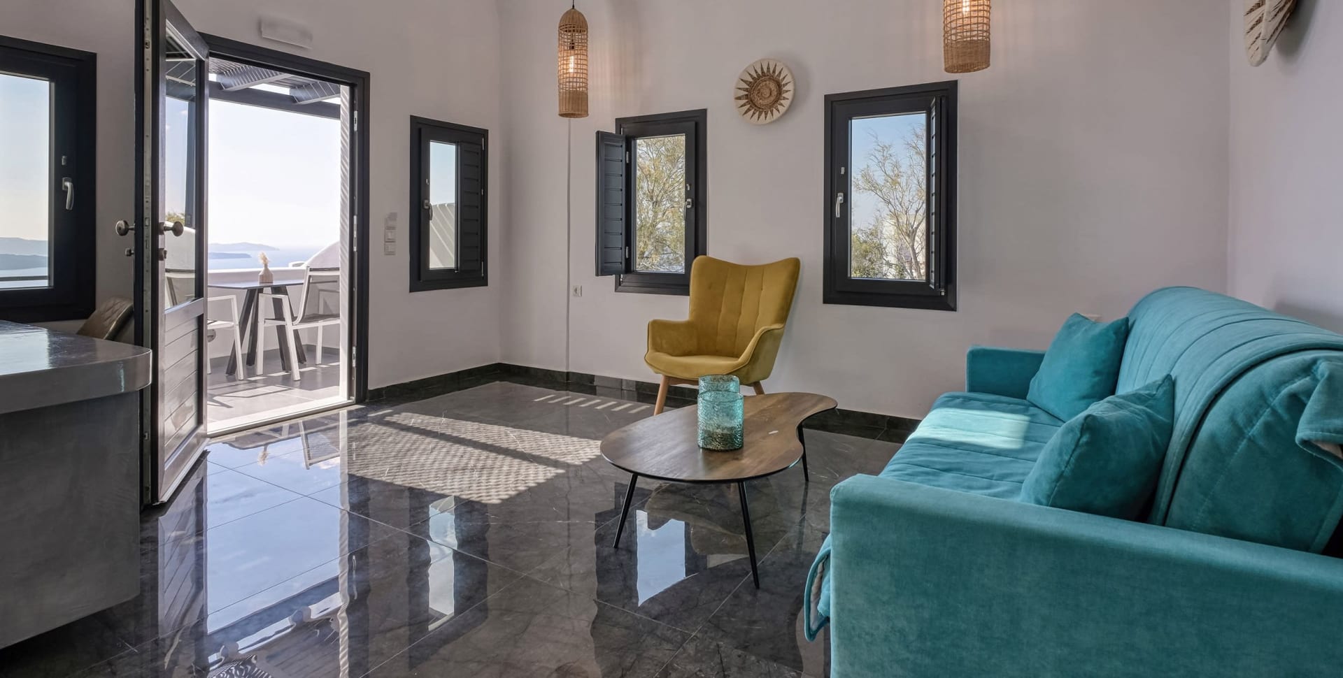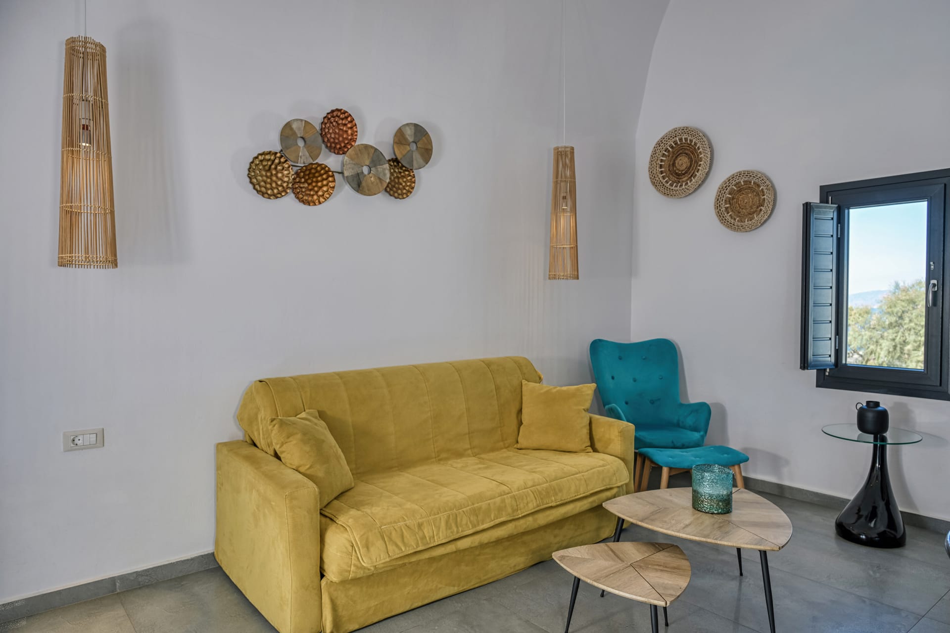 The Elegant Suite opens into traditionally styled spaces, arranged in two separate rooms—the bedroom, featuring a cozy double bed, and an open plan living area featuring a sofa-bed and a kitchenette. The suite also offers an en-suite bathroom and a balcony that faces the volcano, the caldera, and the sea.