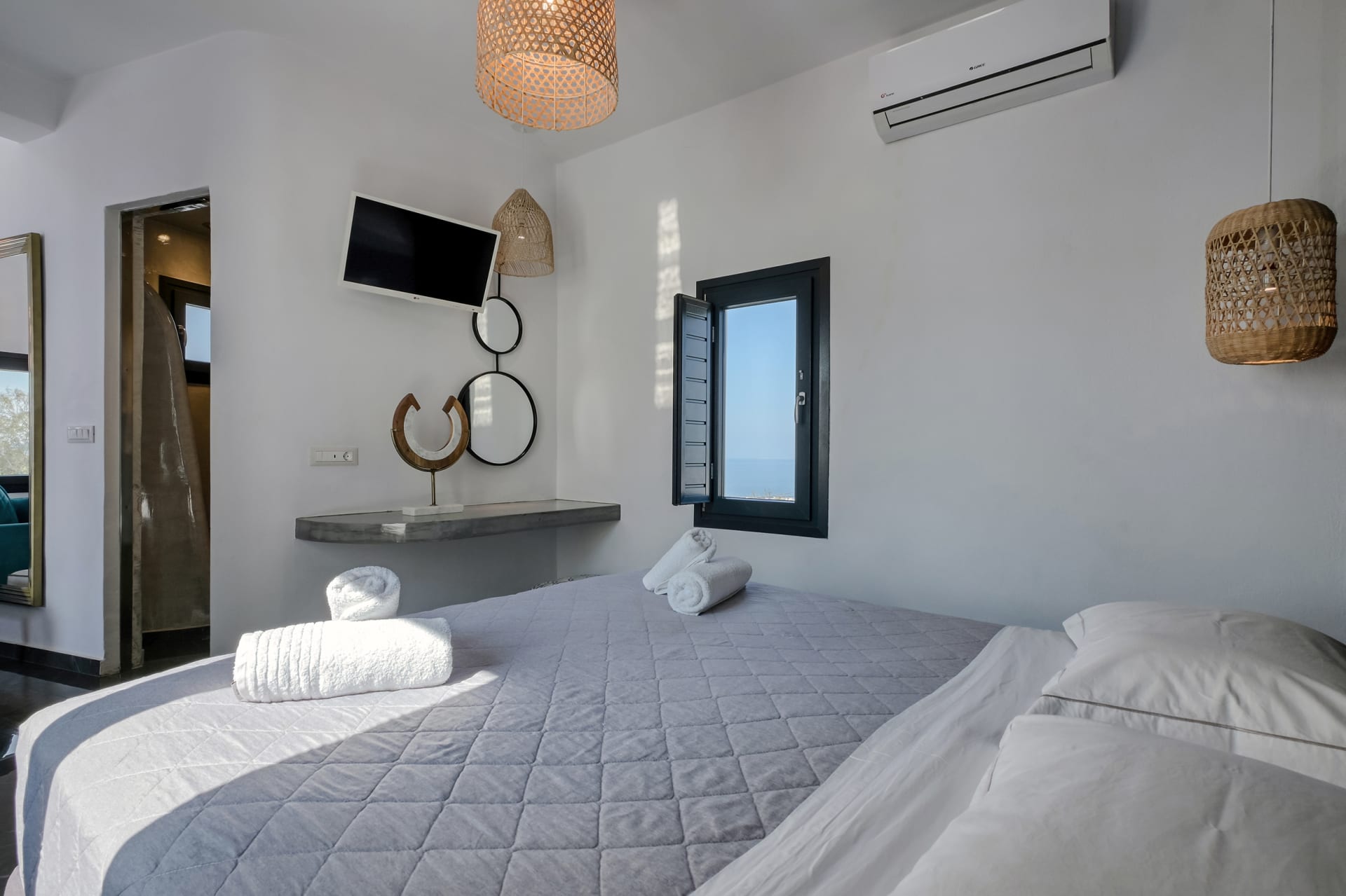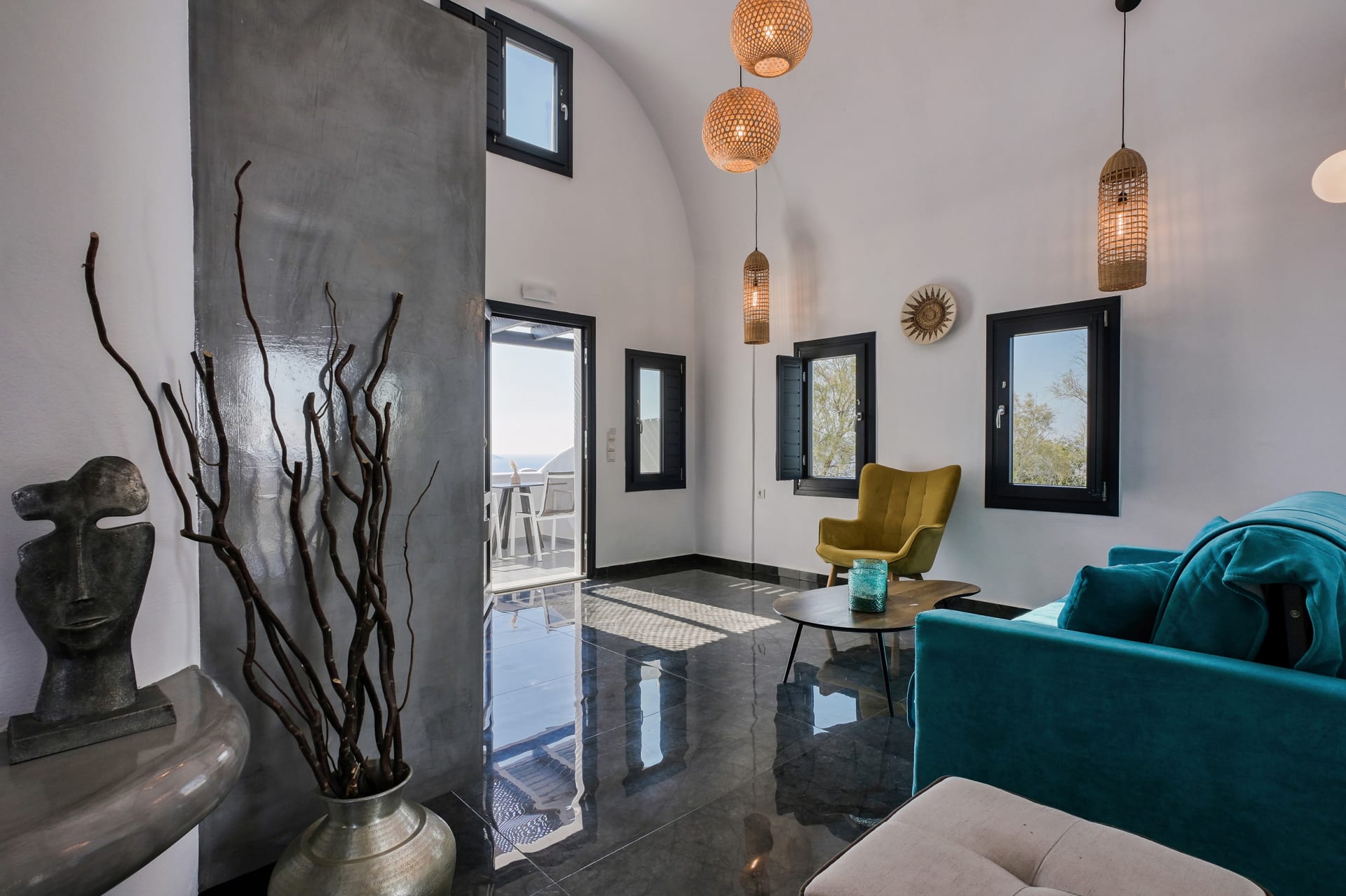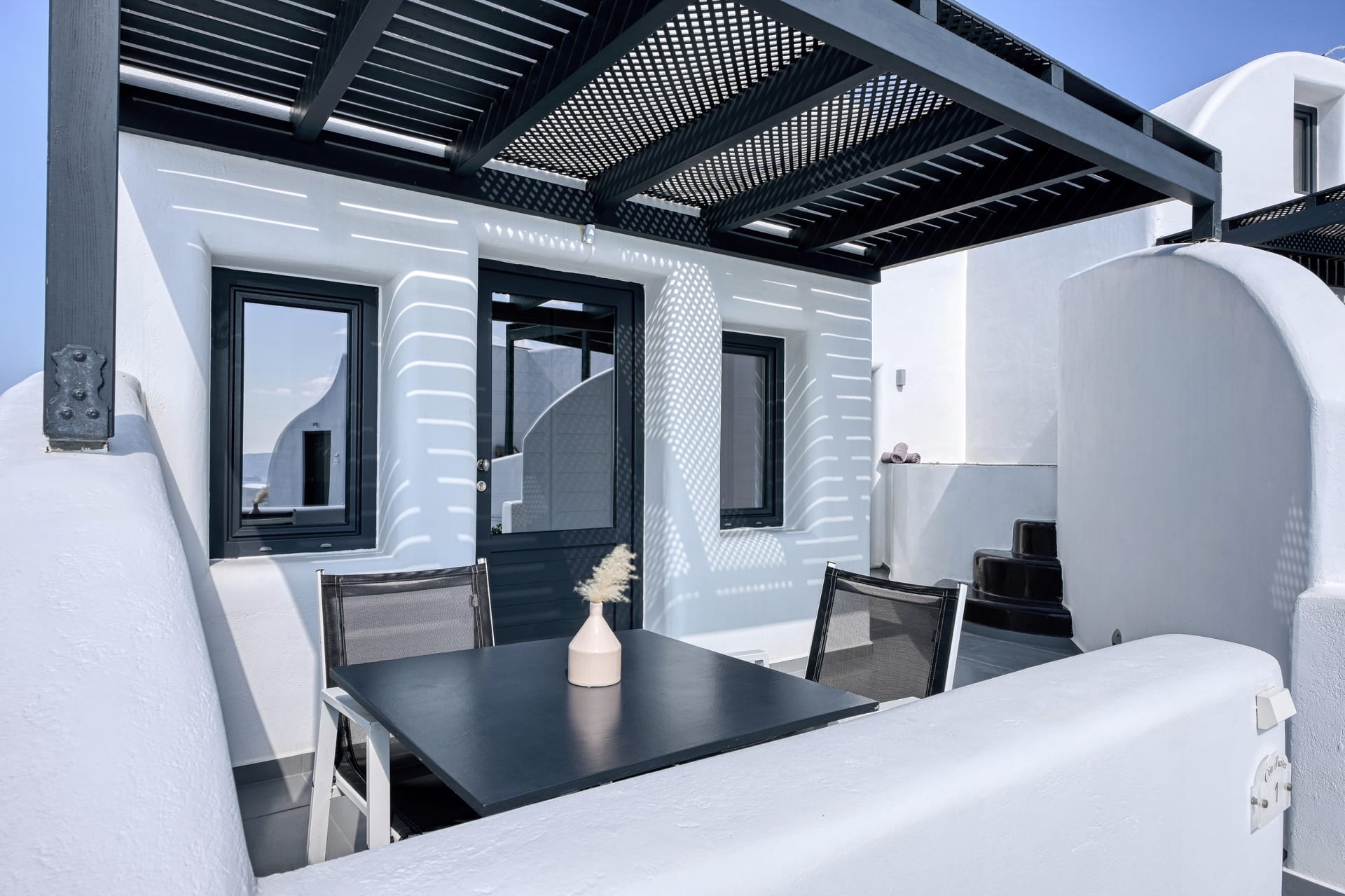 The Elegant Suite opens into traditionally styled spaces, arranged in two separate rooms—the bedroom, featuring a cozy double bed, and an open plan living area featuring a sofa-bed and a kitchenette. The suite also offers an en-suite bathroom and a balcony that faces the volcano, the caldera, and the sea.