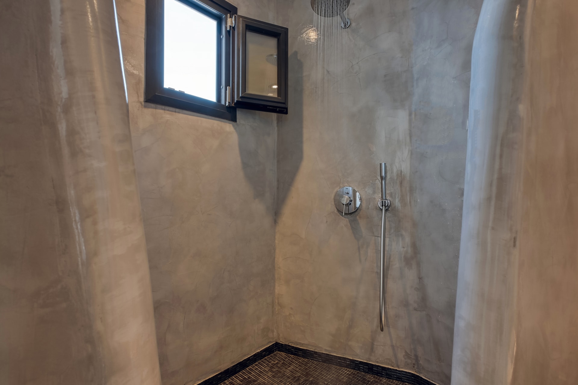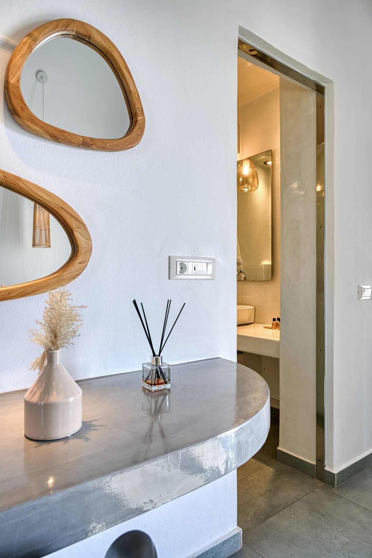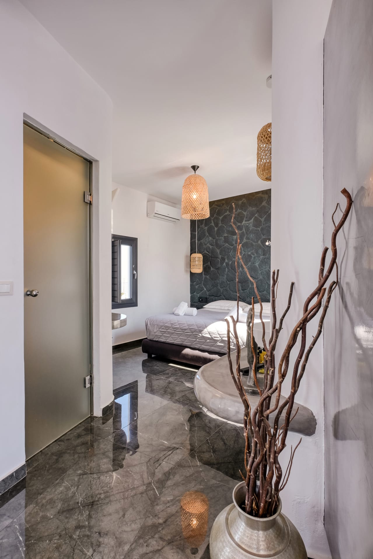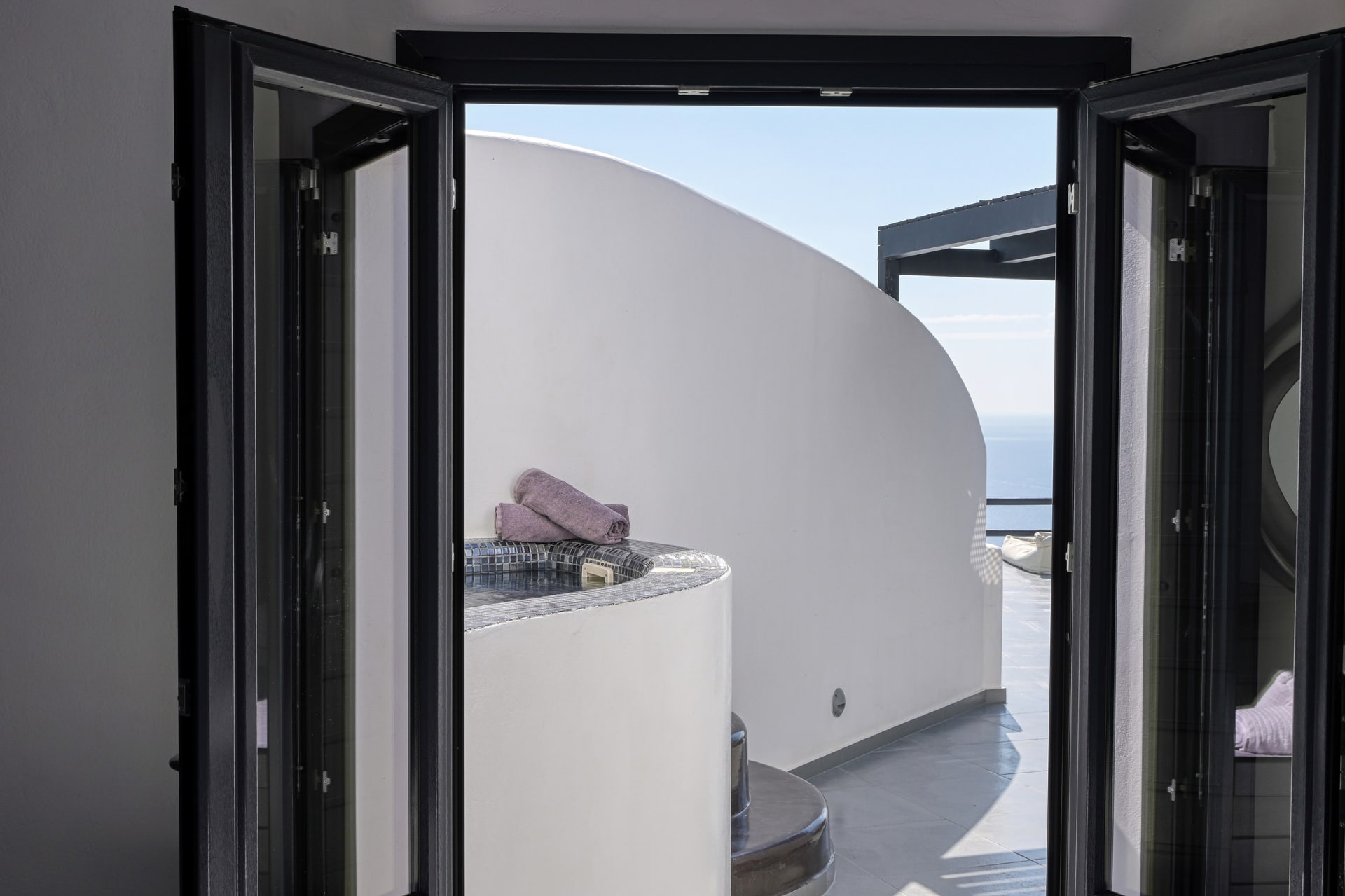 The Elegant Suite opens into traditionally styled spaces, arranged in two separate rooms—the bedroom, featuring a cozy double bed, and an open plan living area featuring a sofa-bed and a kitchenette. The suite also offers an en-suite bathroom and a balcony that faces the volcano, the caldera, and the sea.