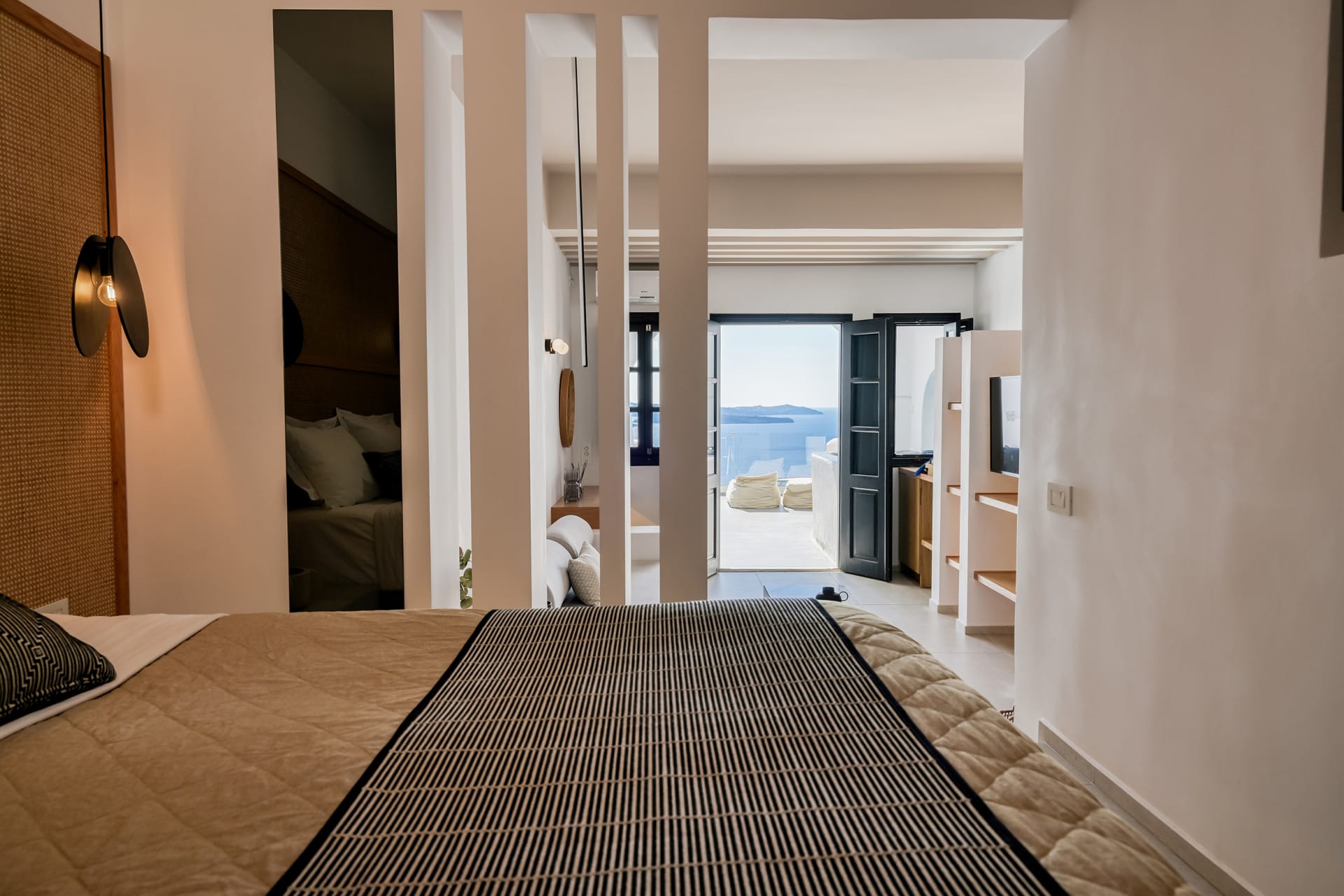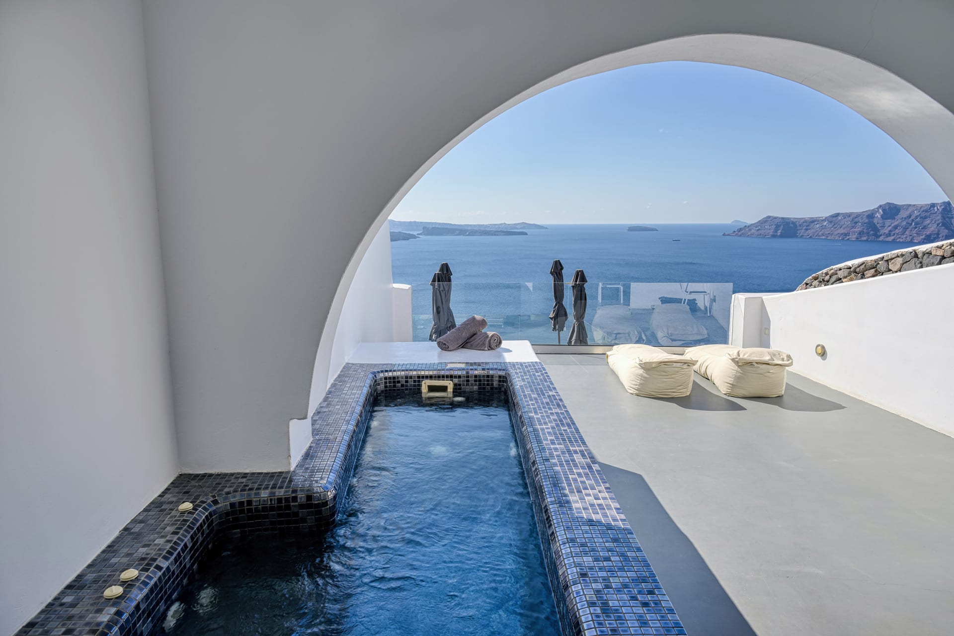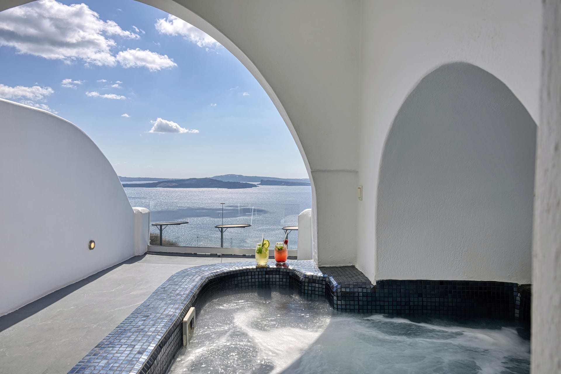 The Honeymoon Suite opens into elegantly romantic interior spaces, revealing a chic living area with a sofa bed, and a separate cozy bedroom with a double bed, complemented with a modern, jet shower bathroom. Outdoors, you will find a spacious balcony with a large, private hydromassage tub that offers stunning views to the volcano, the caldera cliffs, and the sea—an ideal spot to marvel at the magical sunset!