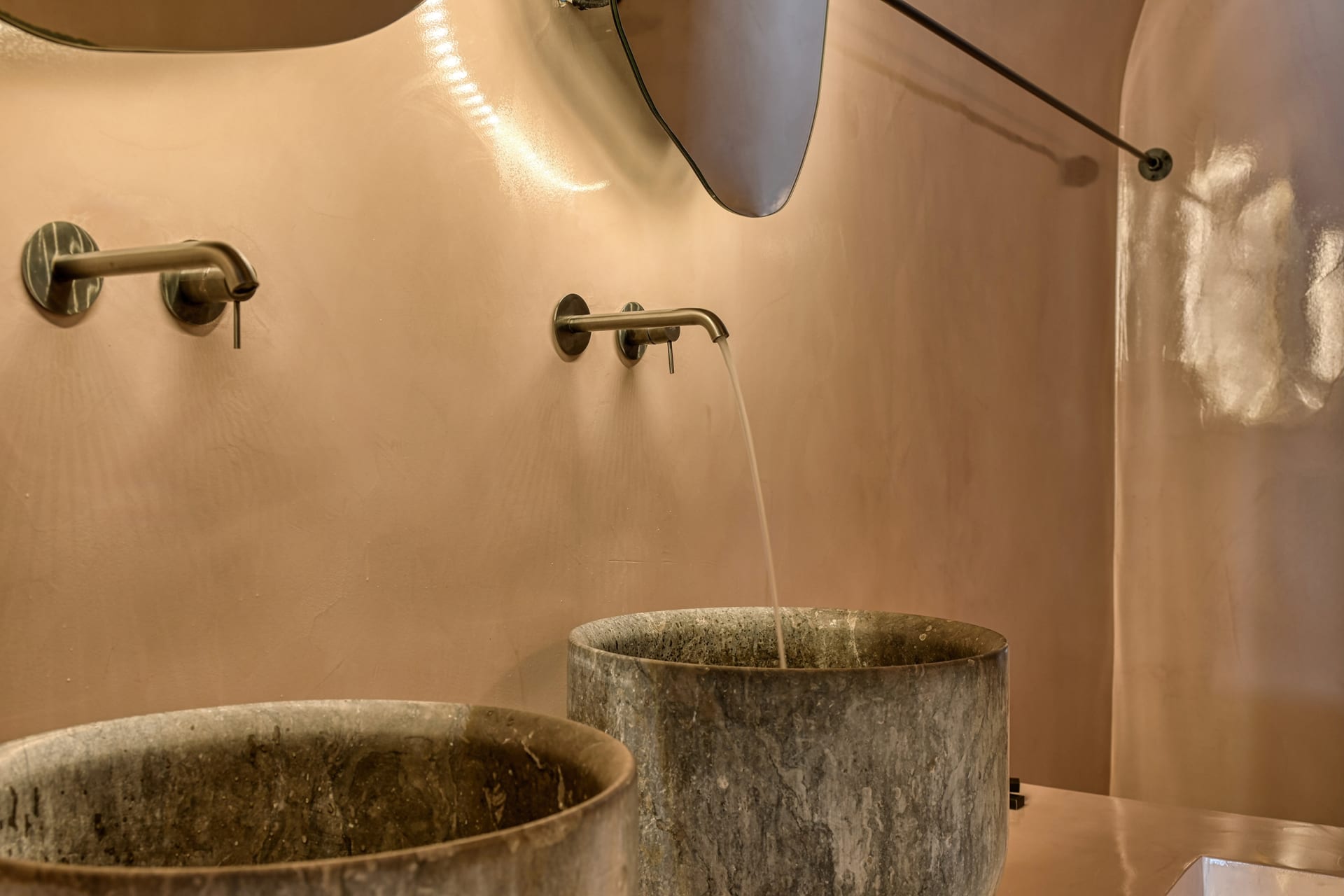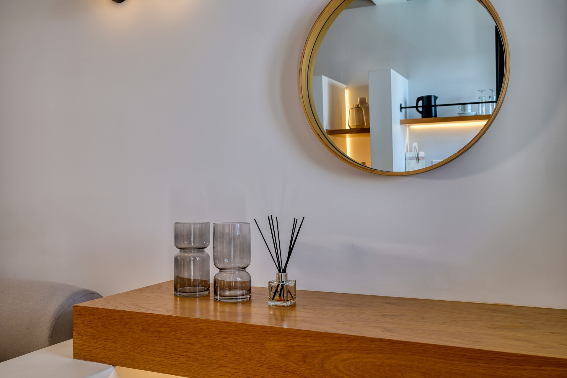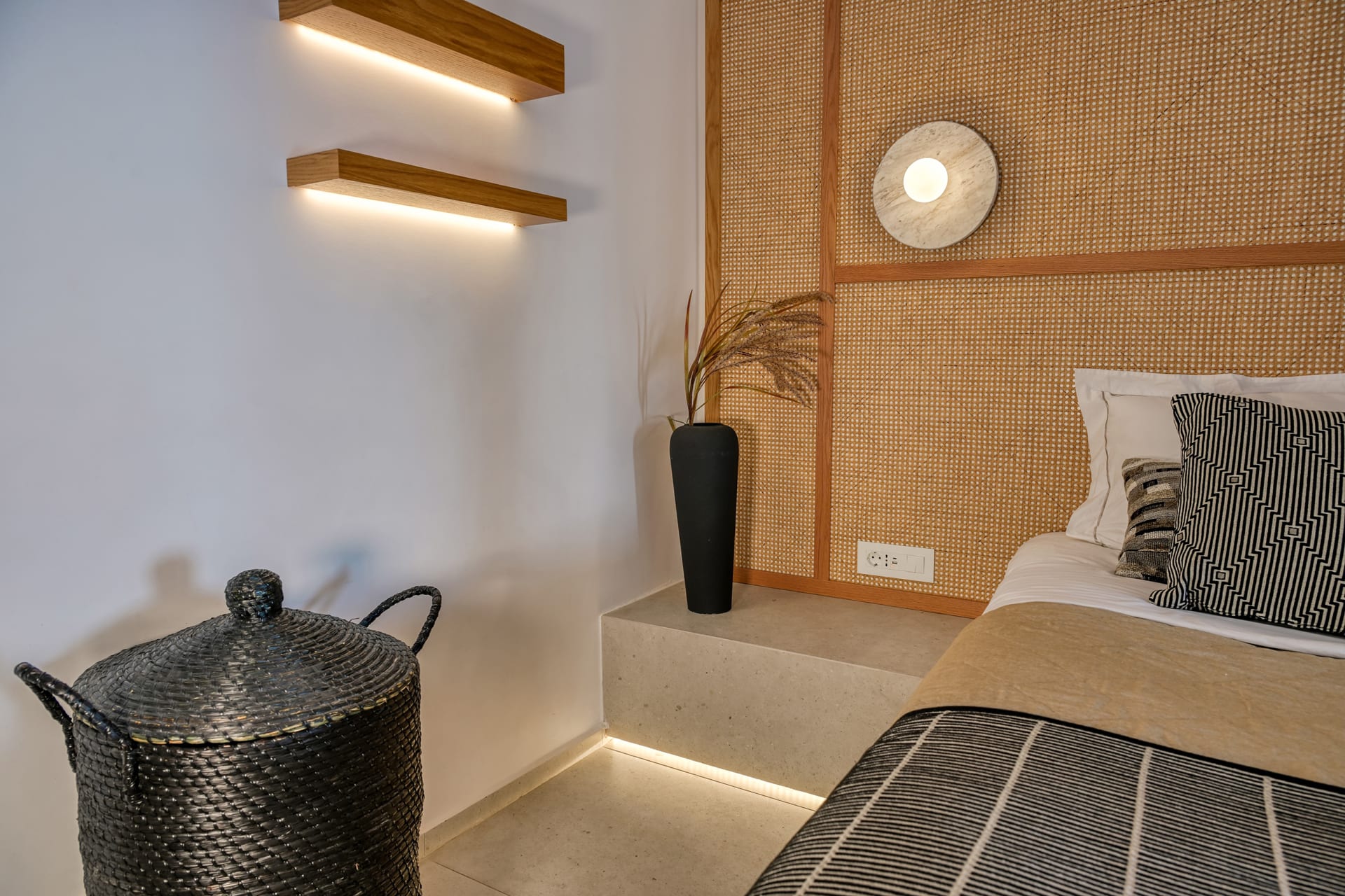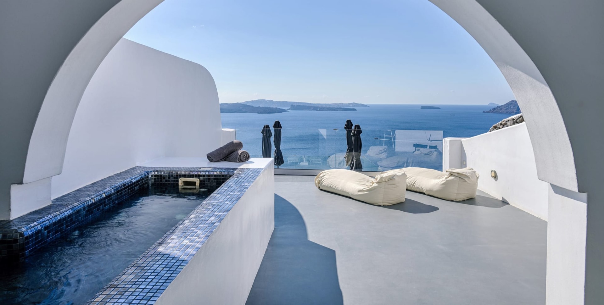 The Honeymoon Suite opens into elegantly romantic interior spaces, revealing a chic living area with a sofa bed, and a separate cozy bedroom with a double bed, complemented with a modern, jet shower bathroom. Outdoors, you will find a spacious balcony with a large, private hydromassage tub that offers stunning views to the volcano, the caldera cliffs, and the sea—an ideal spot to marvel at the magical sunset!