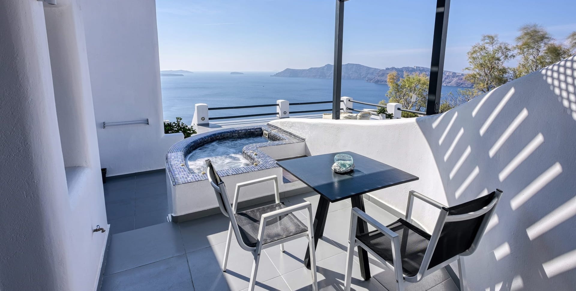 Featuring a balcony with a heated hydromassage tub, the Premier Suite promises you endless moments of relaxation and rejuvenation overlooking the volcano, the caldera, and the sea. The suite opens into welcoming interiors, set up with a stylishly decorated seating area, a large double bed, and a modern bathroom with a jet shower.